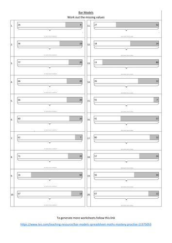 Bar Modelling Worksheet - Comparison Model Questions pdf, 646.49 KB This is the second in a series of worksheet sets on Bar Modelling from the White Rose Maths Hub. This set contains 3 worksheets. The first introduces students to the bar model comparison diagrams and students have to find missing values. All of the questions involve addition and subtraction within 100.